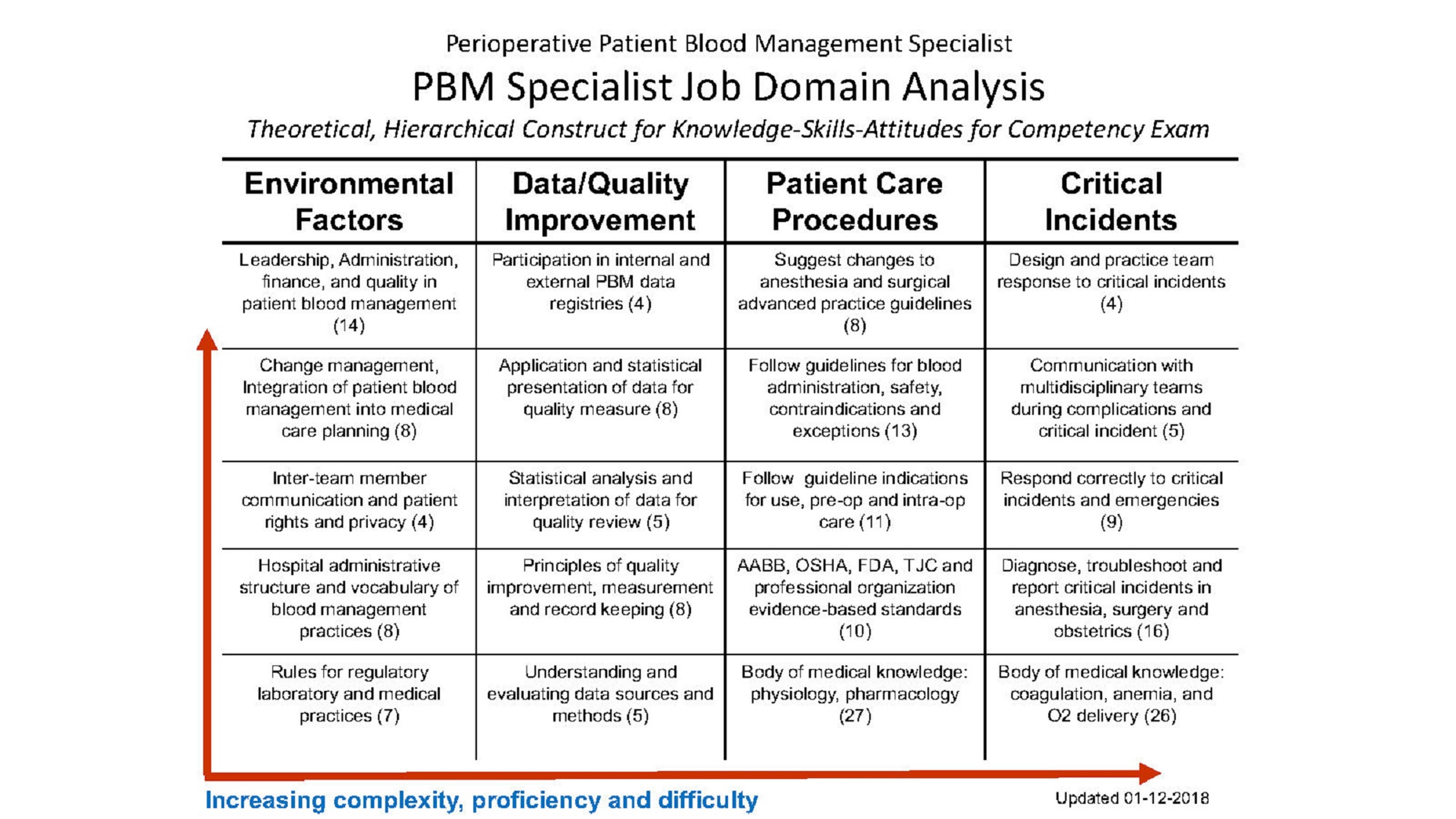 - The candidate must have knowledge of statistical analysis, laboratory, blood banking, and education techniques with preparation to perform leadership, coordinating, or educational roles for a patient blood management program involving inpatient perioperative and surgical practices. See the Job Analysis Chart for reference.